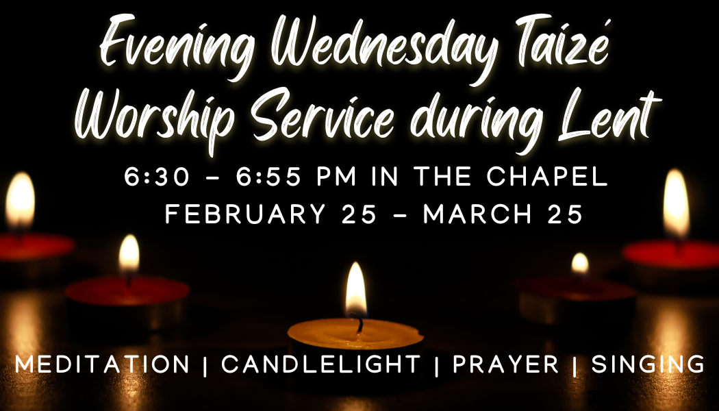 Join us on Wednesdays during Lent February 25-March 25 from 6:30-6:55 PM in the Chapel for a meditative Taize prayer service. (No service on April 1.)
