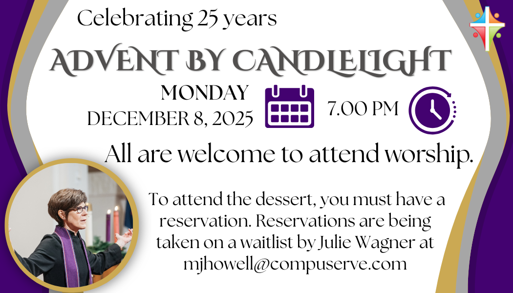 Advent by Candlelight worship at 7:00 pm. All are welcome to attend the worship service. Reservations for dessert are full.