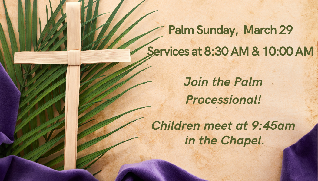 Join us for Palm Sunday at 8:30 and 10:00 AM. A palm processional will be at 10 AM with children lining up with the Choirs at 9:45 AM>