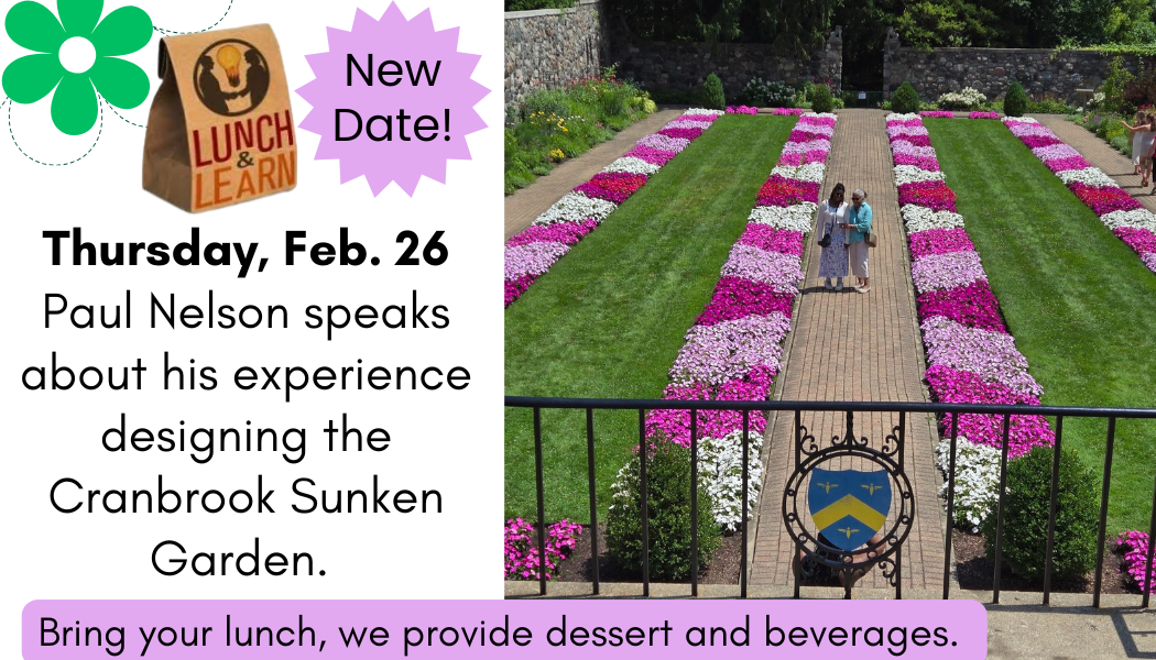 Join us for Lunch & Learn from 11:30 AM-1:00 PM where we learn from the designer of the Sunken Garden at Cranbrook. Bring your lunch, we provide dessert and beverages.