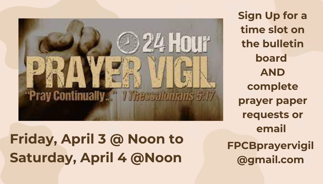 Pray with us for 24 hours from Noon on Friday to Noon on Saturday. Submit prayer requests through cards at church or at FPCBprayervigil@gmail.com