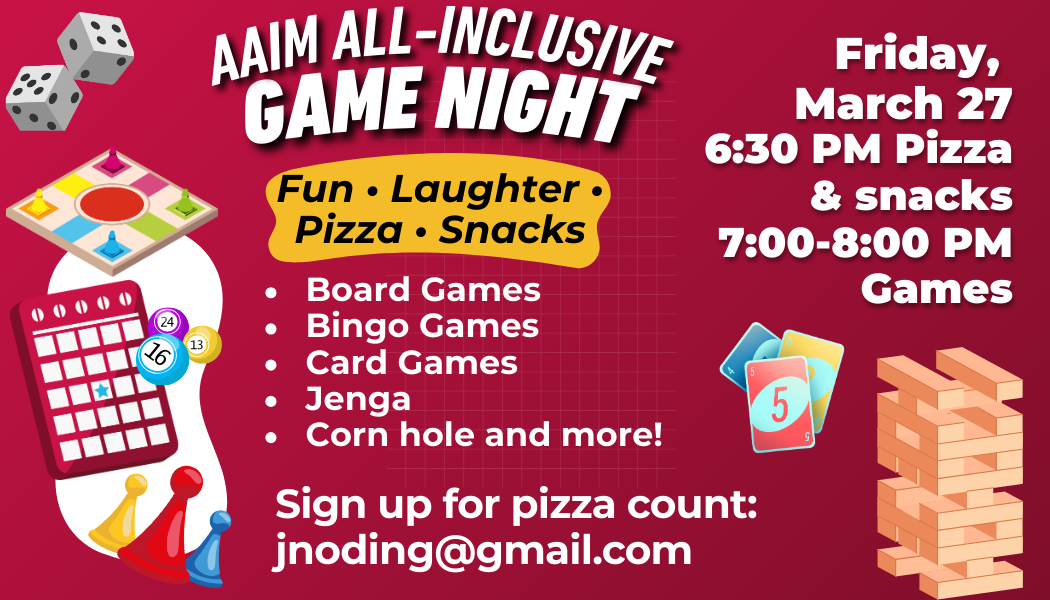 Join us for our AAIM All-Inclusion Game Night from 6:30 - 8:00 PM. Games of all kinds, pizza, and snacks. Email Jodi at jnoding@gmail.com to RSVP.