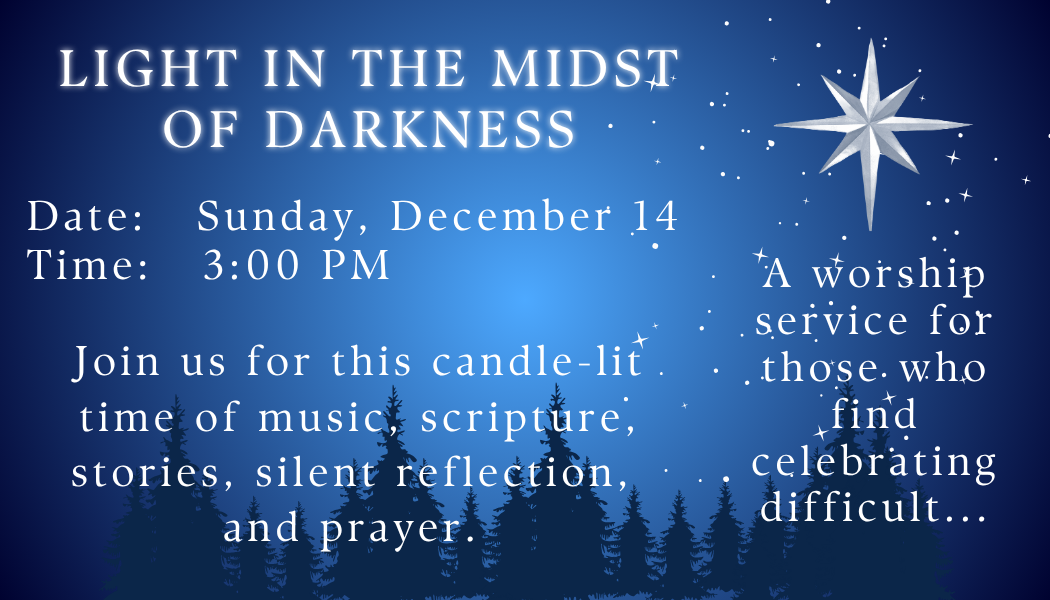 Christmas can be a bittersweet time of year. This quiet, meditative service will hold space to name and share our hurting places with God and prepare our hearts for the coming of Christ.